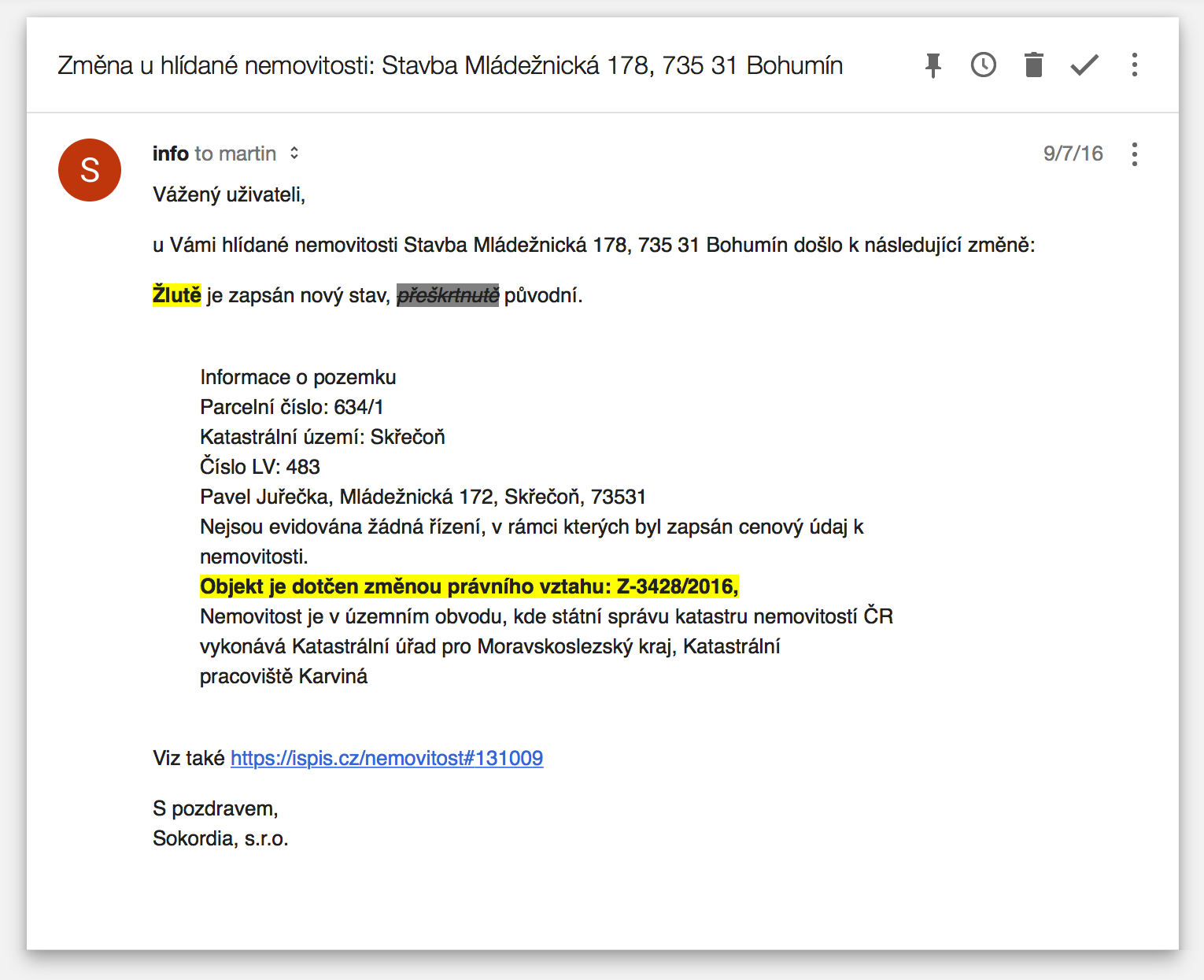 V případě změny, ať už jde o změnu majitele, změnu v omezení vlastnických práv, zápis exekuce, smluvní hypoteční zástava či cokoliv jiného, jste upozorněni e-mailem.